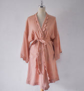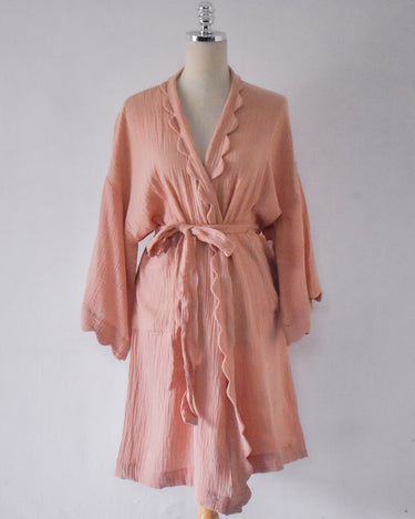 Our beautiful gauze kimono loungewear. Made from airy, lightweight gauze, in blush pink color.  It's your new go-to for relaxed mornings and cozy evenings. We've added sweet scallop edging to the neck and sleeves for a touch of charming detail, making this robe as lovely to look at as it is to wear.